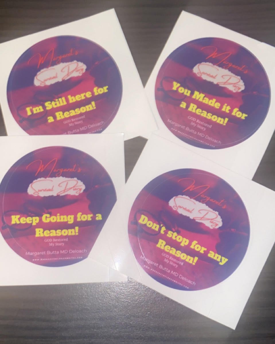 Choose from 4 different type of 2" circle marked stickers, These stickers include a motivational quote that the author wants you to always remember throughout any tough trial that may come in life. So stick these in your car, at work, window, door, wherever you can see it daily and always declare it to your self!